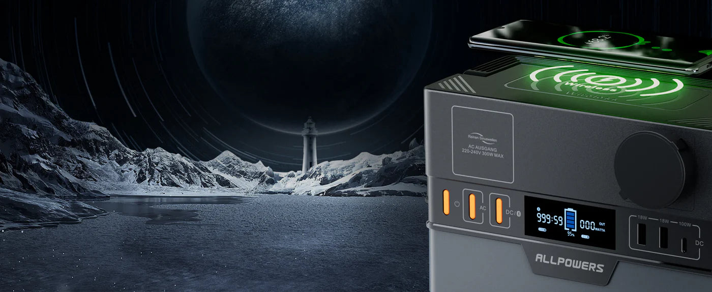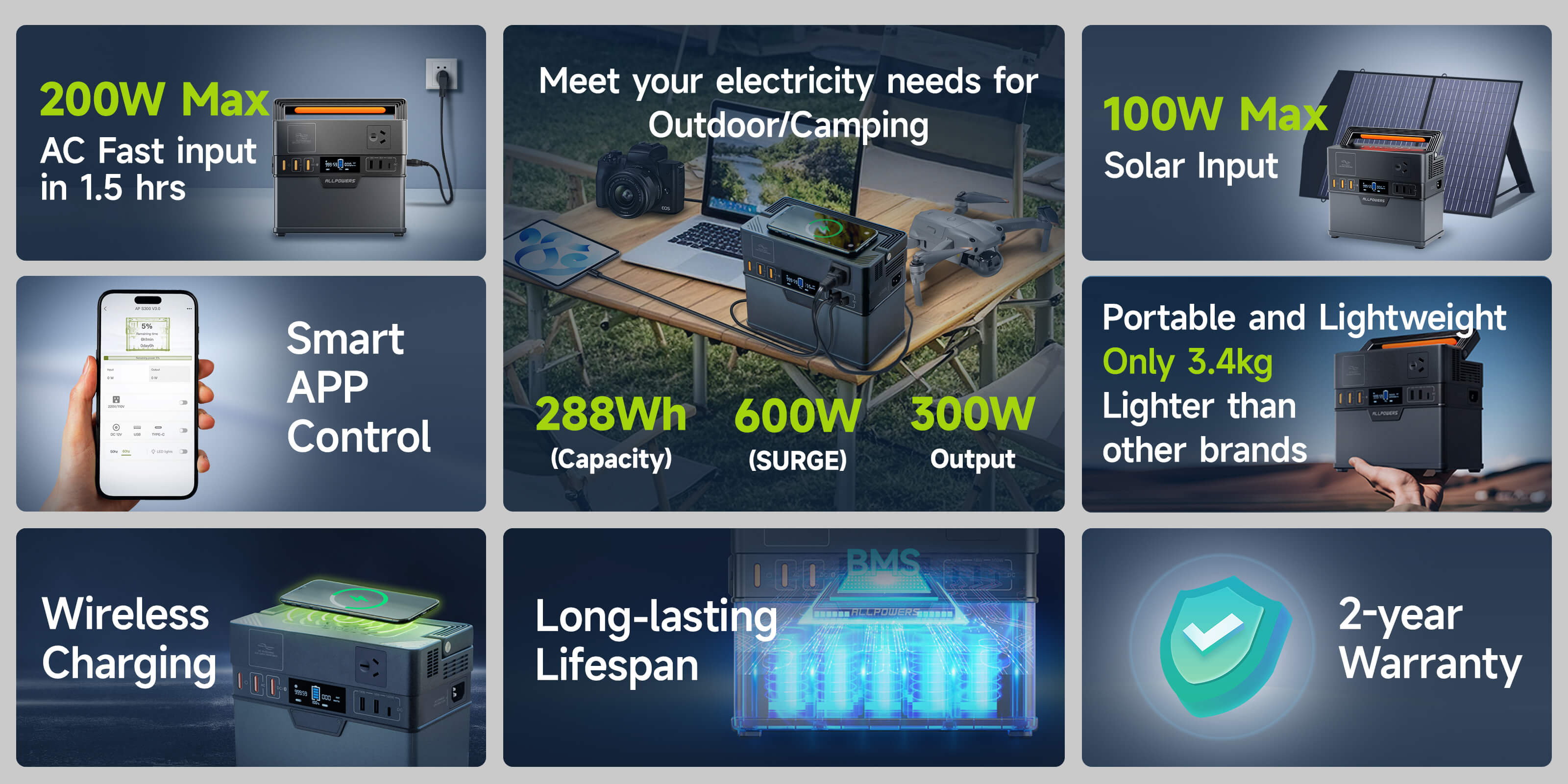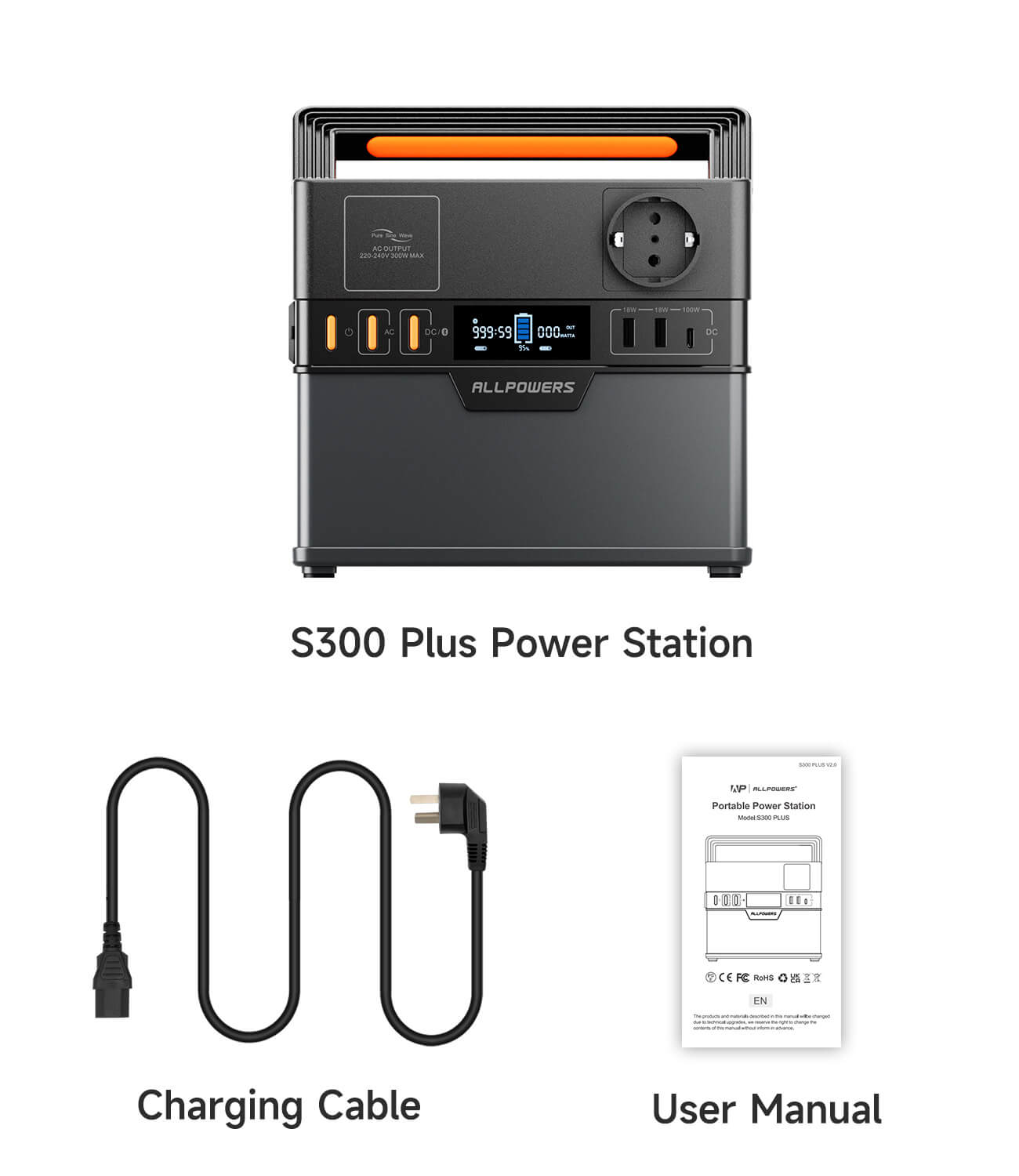 ALLPOWERS S300 Plus portable power station is equipped with a 288 watt-hour battery pack. Portable power source features 1*AC ports (240v), 300W(peak 600w),2*USB-A ports,1*, 1*USB-C ports ,1*Cigarette lighter socket(12V/8.5A) and a wireless charger(5V/1A) at the top. Allpowers portable power station gives you the ports you need to charge all of your devices at the same time.