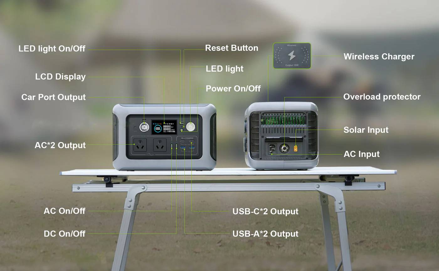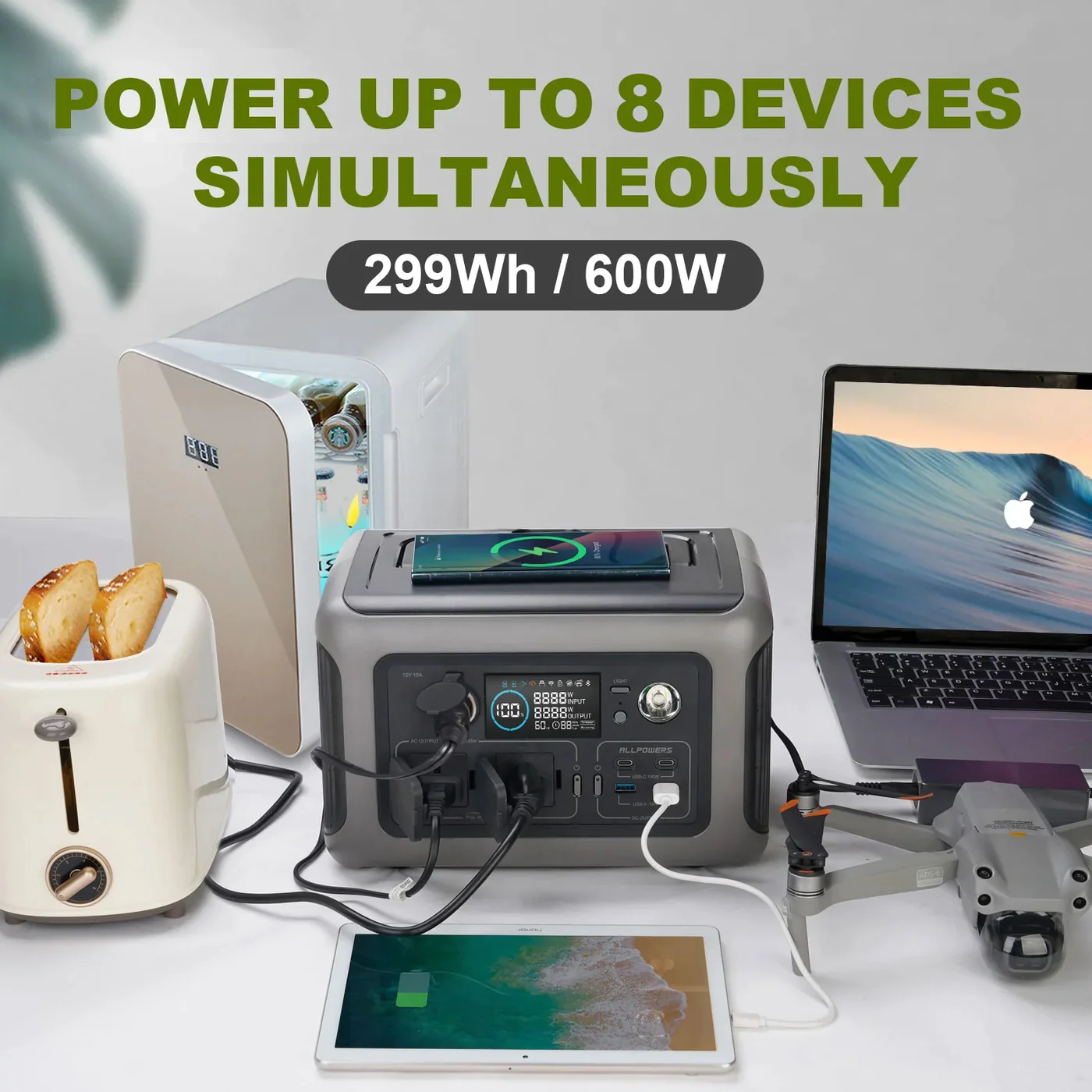 ALLPOWERS portable power station features 2* AC outlets (240V 600W, 1200W Peak), 2 * USB-C ports, 2* USB-A ports and , 1* car cigarette lighter (12V/10A) and a 15W wireless charger . With an output of up to 600W, ALLPOWERS R600 outdoor generator is specially designed for charging kettle, juice, laptops, car refrigerator, drone and other outdoor electronics, power your outdoor adventure without worry.