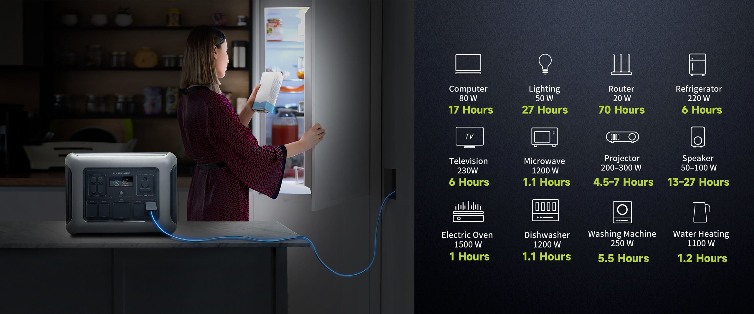 ALLPOWERS R2500 portable power supply is equipped with UPS (uninterruptible power supply). After turning on the UPS function, even if there is a sudden power failure, the connected electrical products will not stop and can be used as they are. There is a momentary interruption when switching, but only 15ms if the switching takes longer.Since the current of an ordinary household AC power outlet is 15A, the maximum output power is 1500W when using UPS mode.