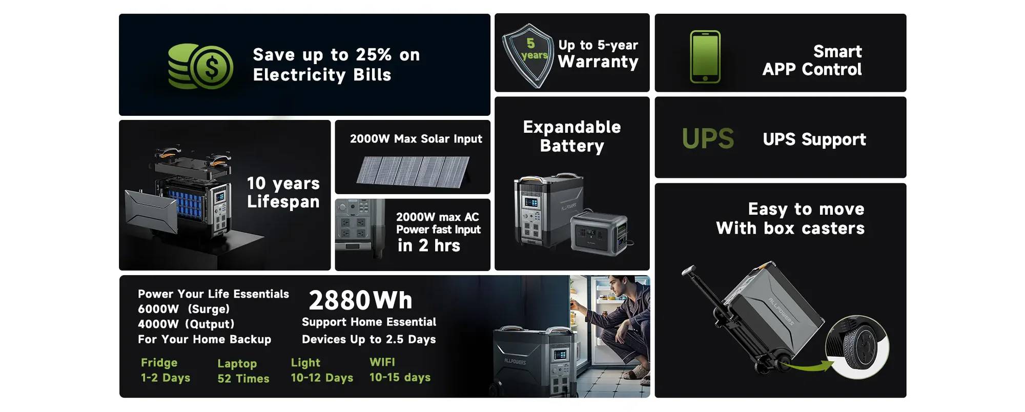 - 4000W AC Pure Sine Wave Output (6,000W Surge);