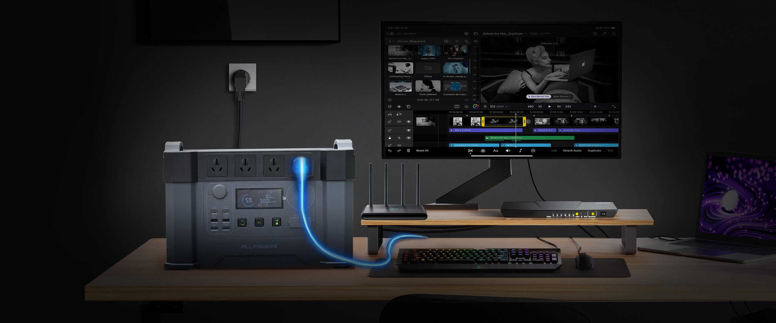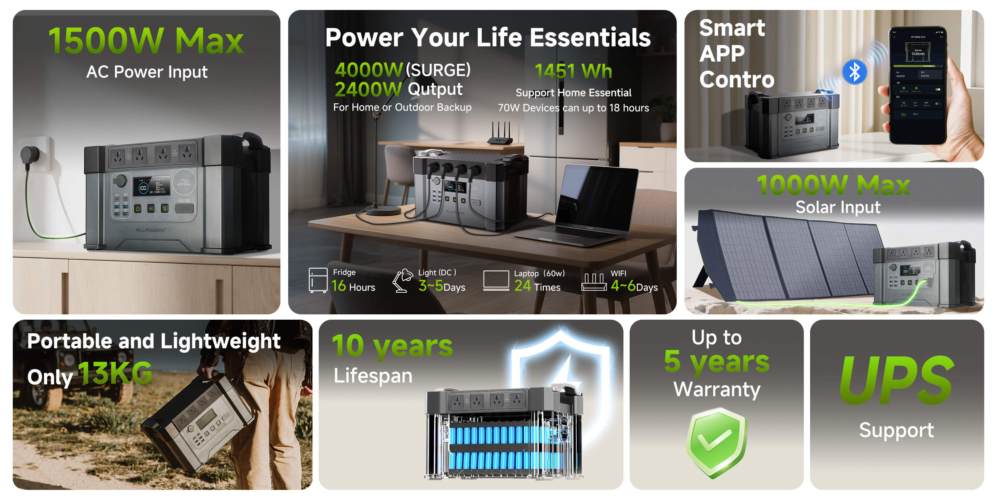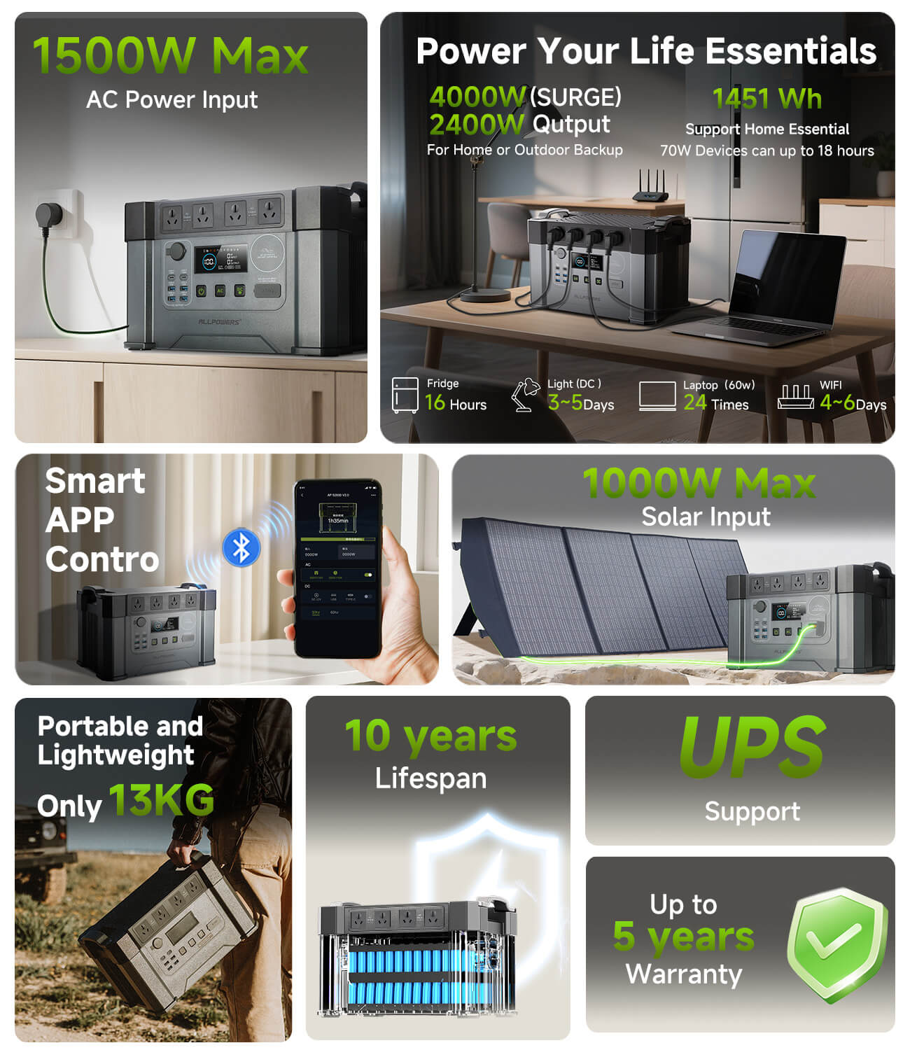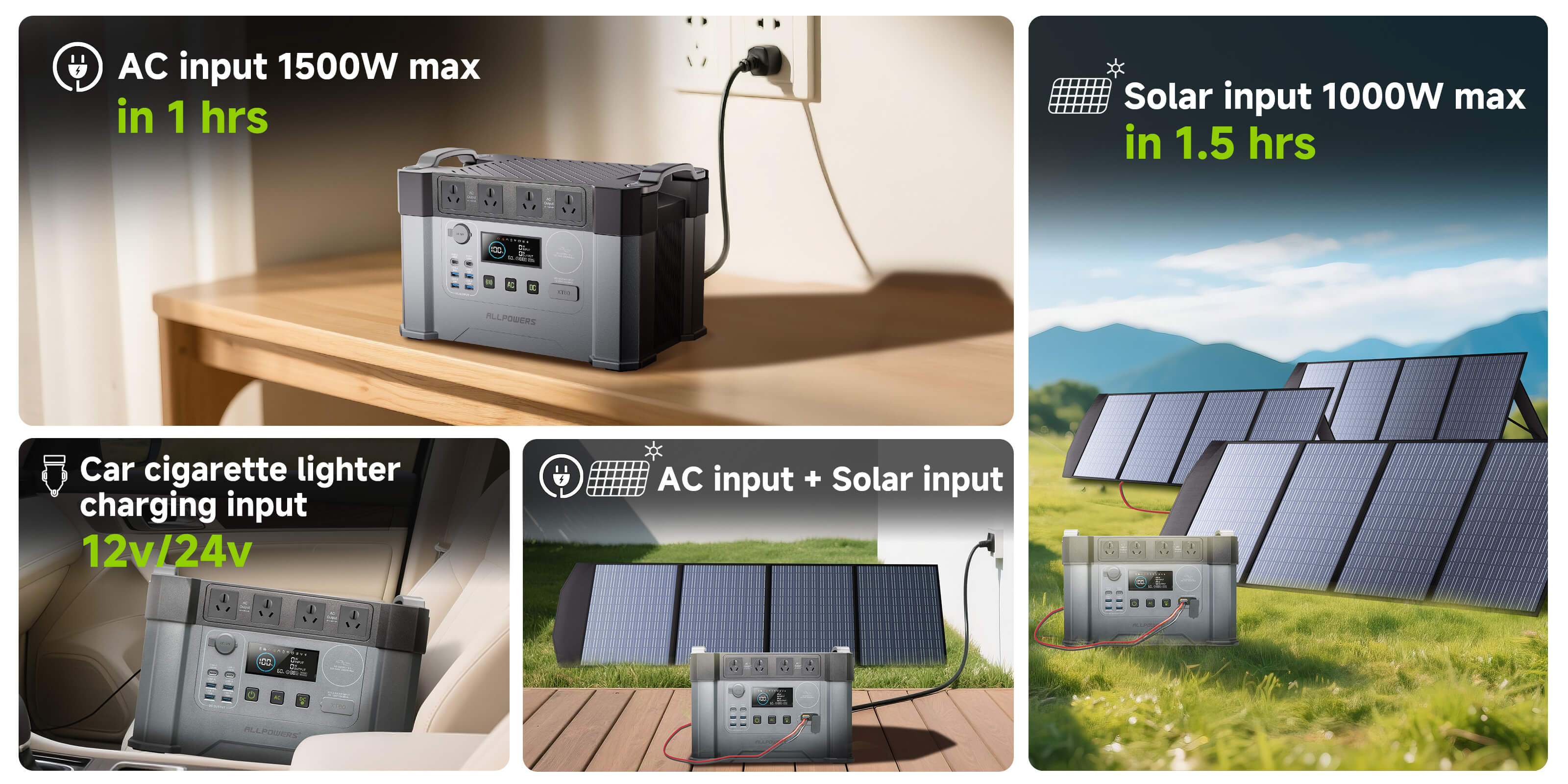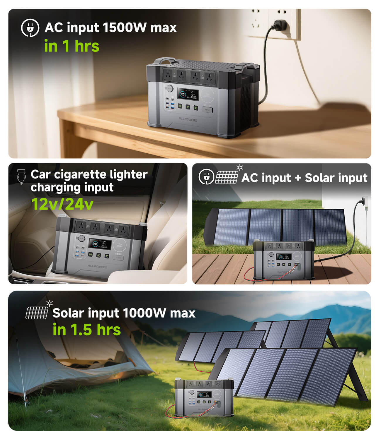 With 1500W AC input (NO HEAVY, BULKY ADAPTOR or BRICK), ALLPOWERS S2000 Pro portable power station can be fully recharged within 1.5 hours. Via MPPT 1000W max solar input, solar generator can be fully recharged within 3 hours (increases 20% compared with ordinary solar charging without MPPT controller).