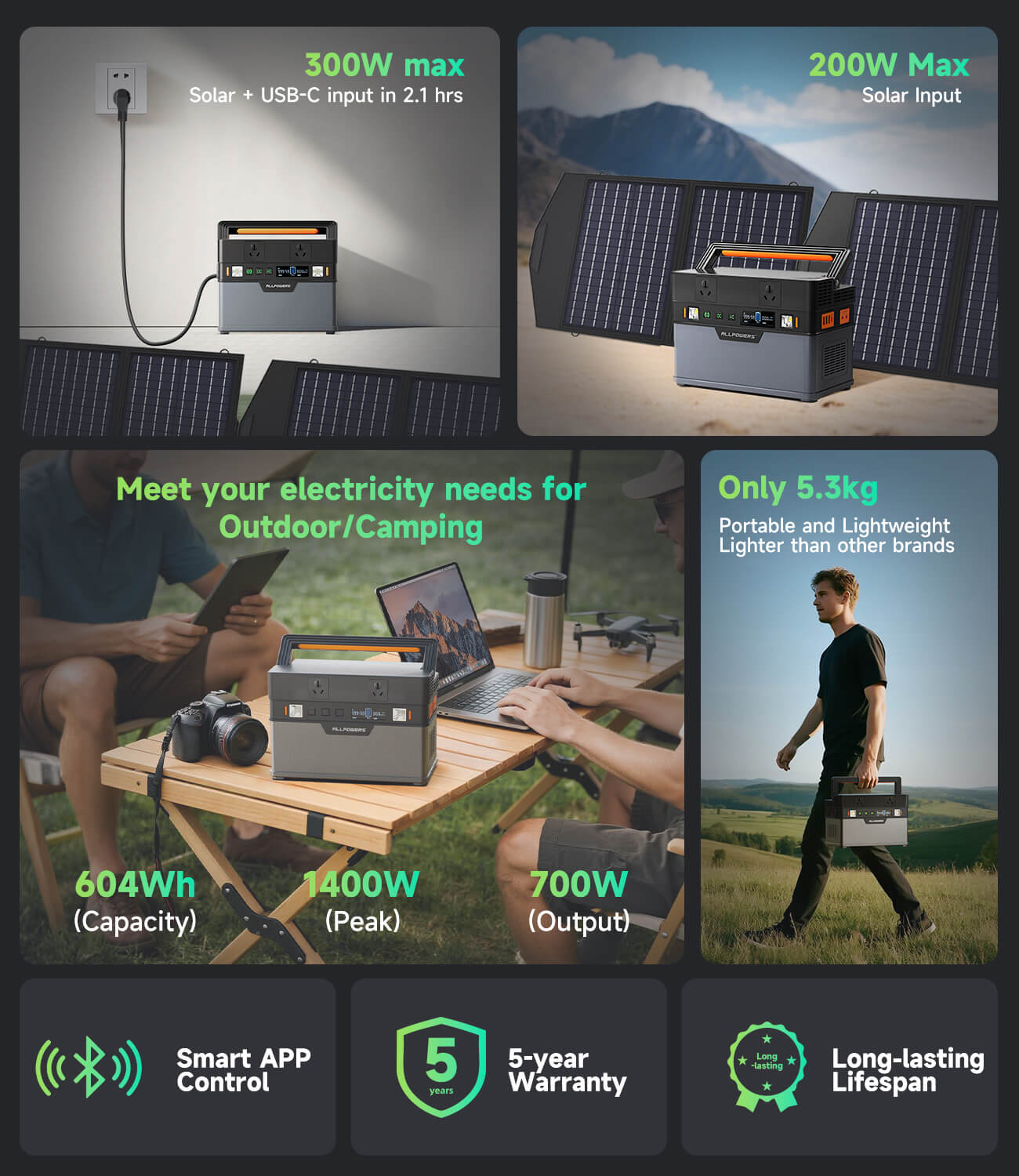 S700 Portable power station features 2x Pure Sine Wave AC outputs (240v 700W, 1400W Peak), 3 x USB-A ports, 1x PD 100W USB-C outport, 1 x Regulated car port, 2 x DC ports. Connecting via Bluetooth without internet, ALLPOWERS APP making operation easy stable. Allows you remote control it via your phone whenever and wherever. Vintage backup battery for your outdoor adventures, camping, road-trip, RV and home use.