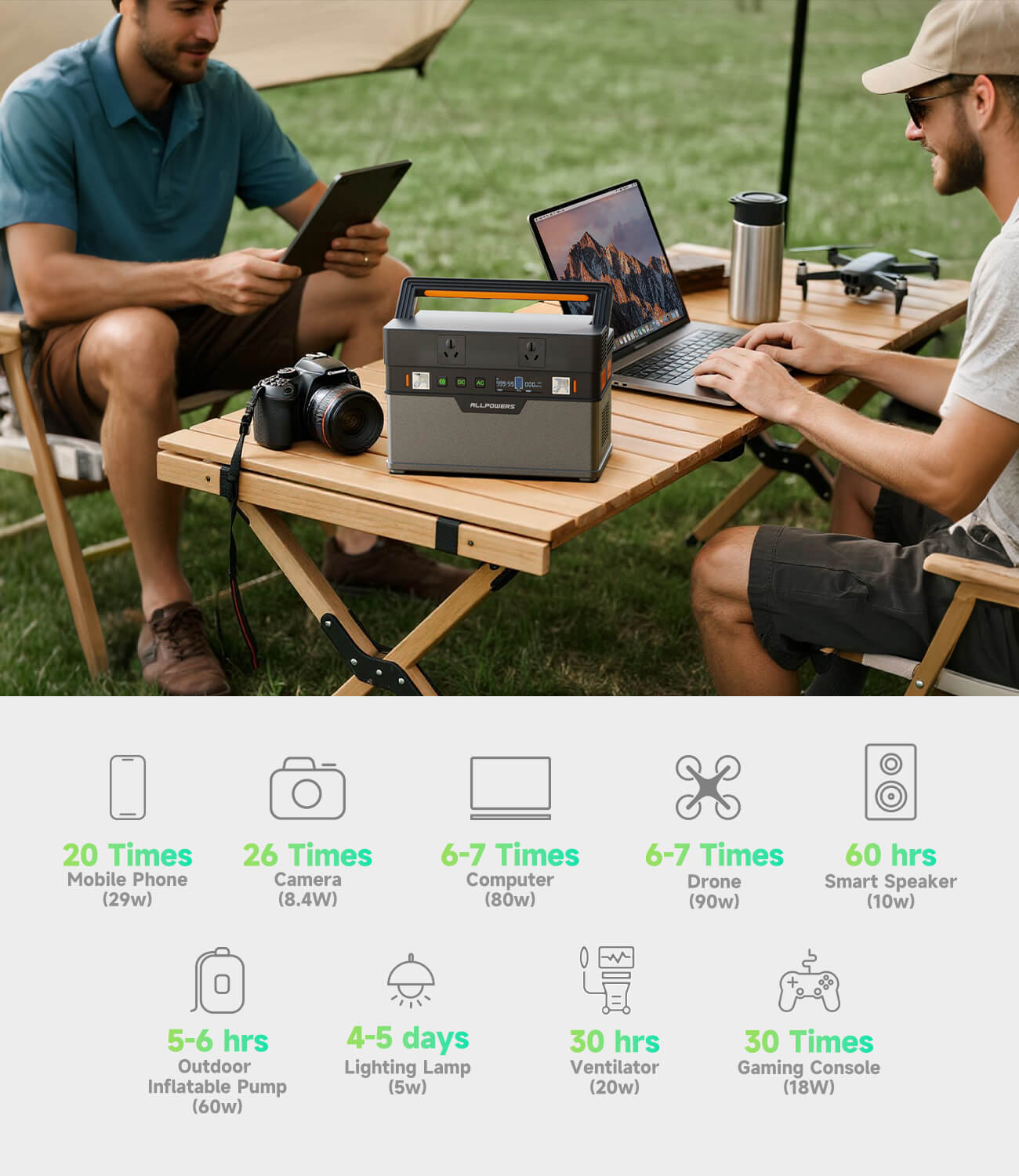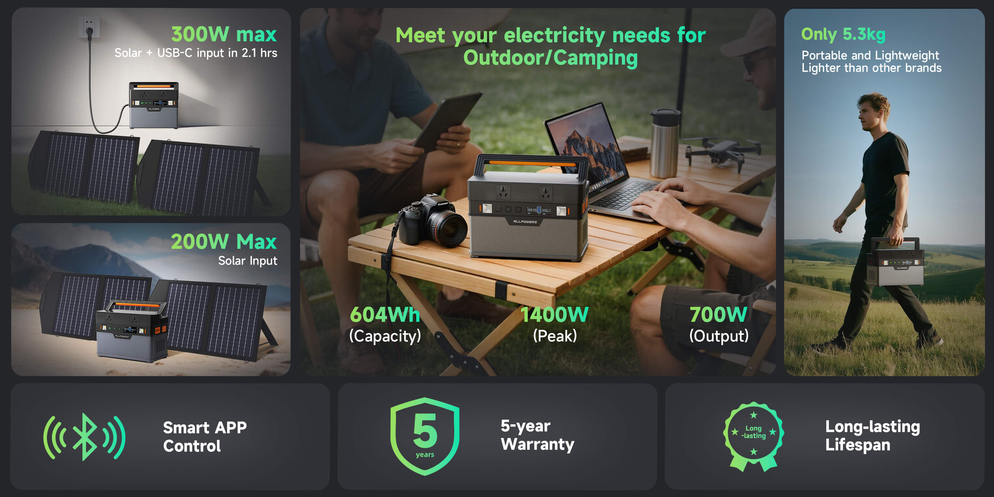ALLPOWERS S700 is a battery power station packing 604Wh into a light 11.6lbs/5.3kg and small size with a carrying handle design makes the mobile power station for camping really portable. With a 604Wh large capacity higher rated power of 700W, it is ready to power many appliances mini cooler, fan, projector, lamp light, and TV for long time. The built-in lamp can be used as emergency lighting.