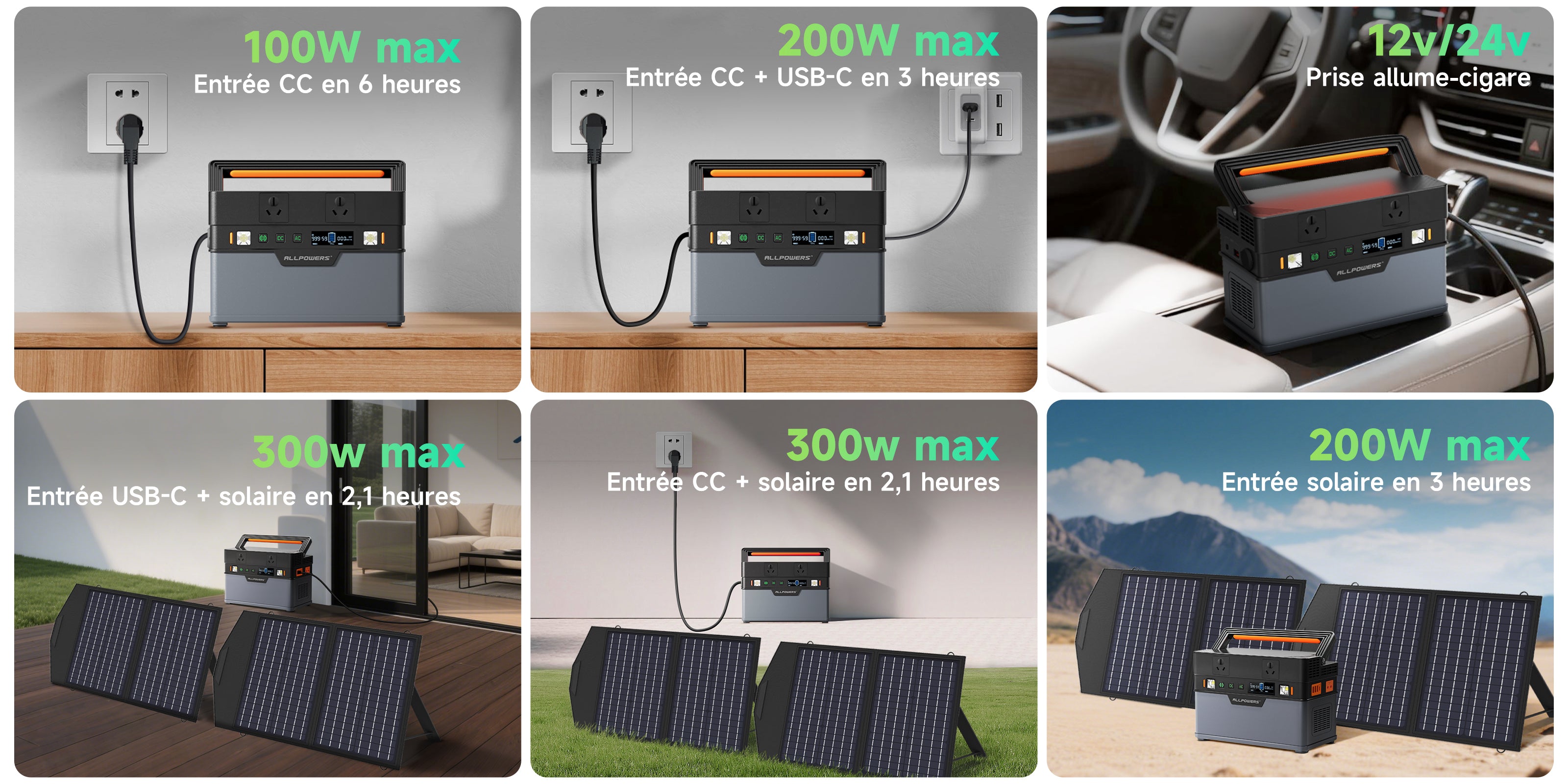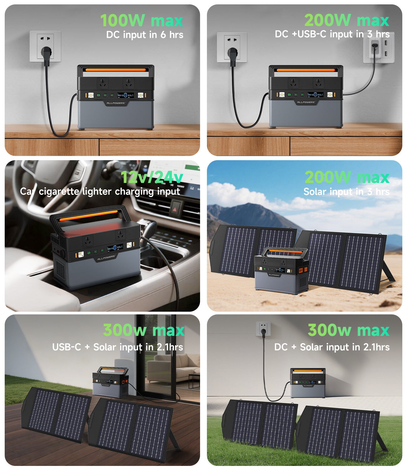 - Multiple charging methods (DC/USB-C/DC+USB-C/solar input/cigarette lighter input/solar input+USB-C or DC);