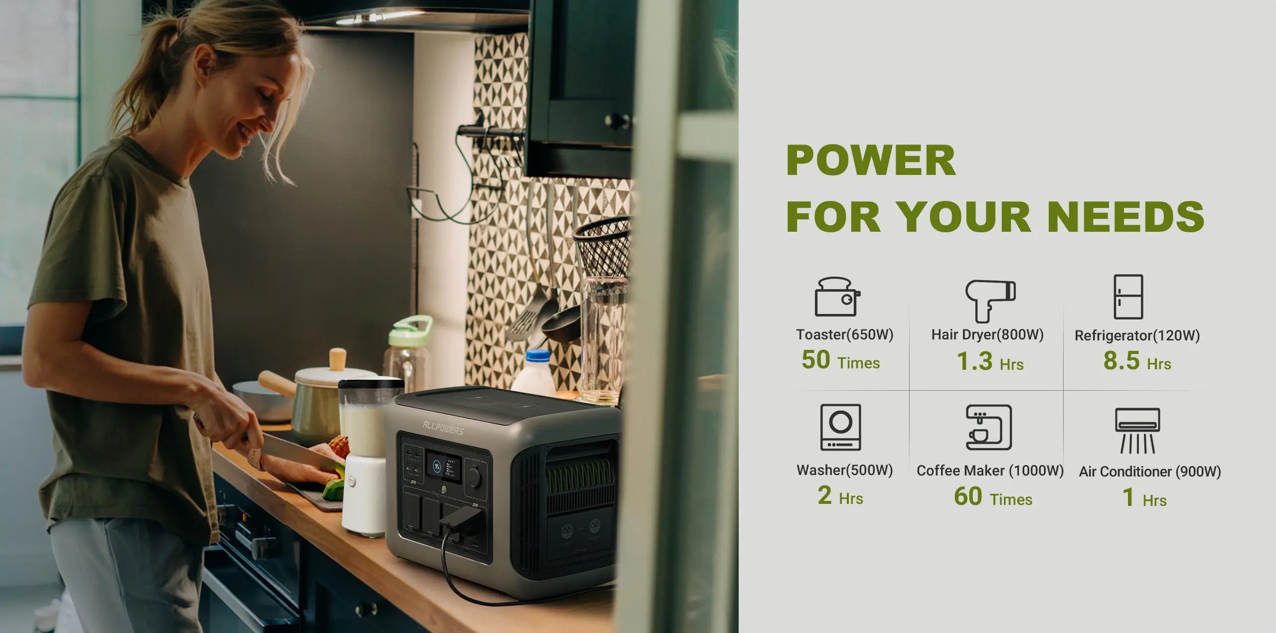 Experience unparalleled performance with its massive 1152Wh capacity and powerful AC output of 1800W (3000W peak). This powerful power station is ready to provide reliable backup power for your home. Whether it's a stormy night or scheduled maintenance, the R1500 has what you need. Keep the lights on, your devices working, and your devices charging.
