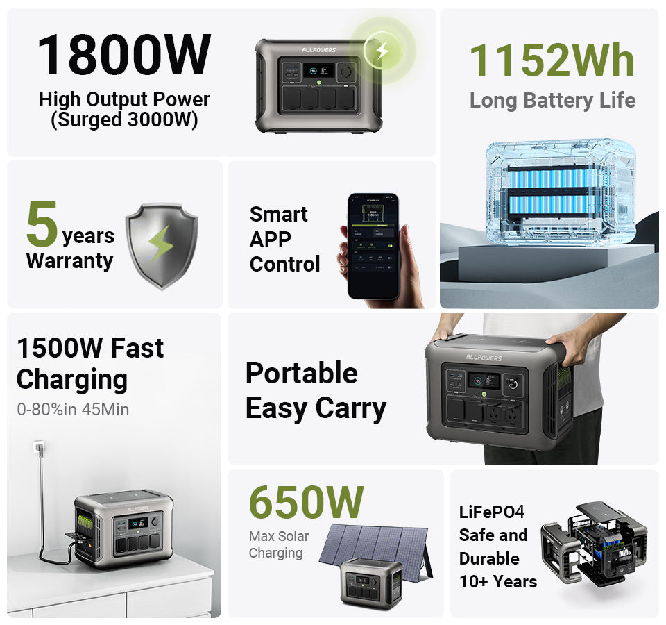 R1500 is equipped with an excellent lithium iron phosphate battery, Due to the low energy density, it is heavier than ternary Li-ion batteries, but has excellent cycle times.Due to our unique technology, the ALLPOWERS R1500 life cycle number exceeds 3500.Even with daily use, it will last approximately 10 years or more.