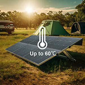 ALLPOWERS 600W solar panel also withstands extreme weather like frozen or heat. Consists of multiple layers of flexible EVA and robust glass fibers for greater durability and mobility. It is also IP67 protecting from scratches, dust, water splashes or soaked in water for a short time.
