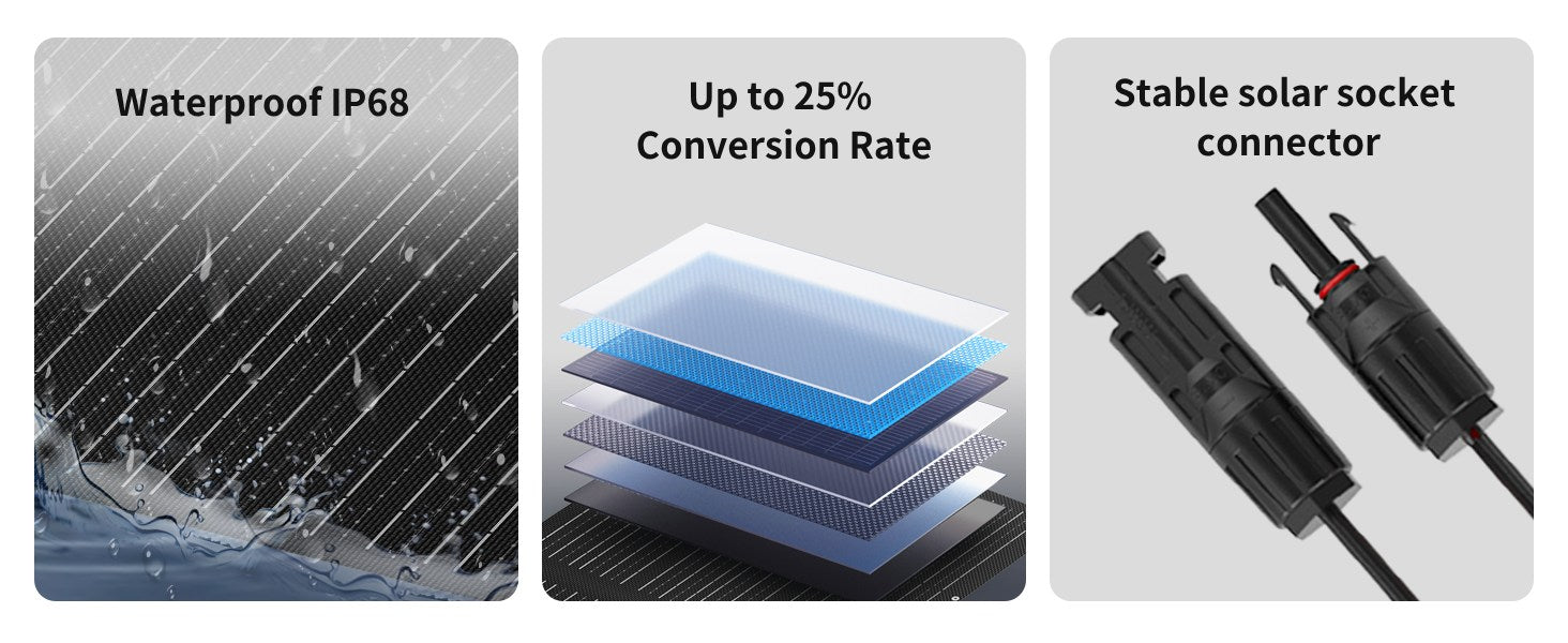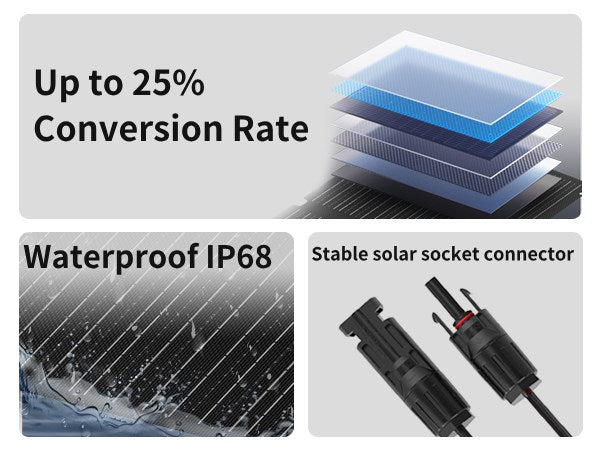 Its IP68 waterproof registration is the highest level of protection, ensuring stable operation even in inclement weather. Its industry-leading 25% efficient conversion rate significantly improves charging speed and captures more energy. Its reliable solar panel connector ensures worry-free power transmission. Professional-grade connectors are drop-resistant, spark-resistant, and safe and stable.