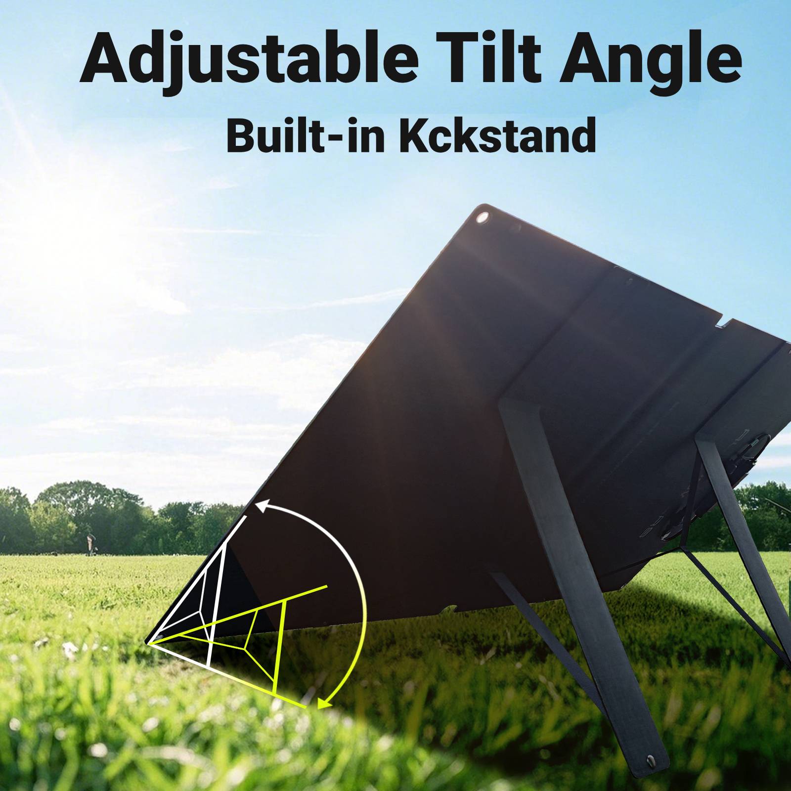 The rear stand has a flexible adjustment function. You can adjust the angle of the solar panel according to the weather and the angle of the sunlight to maximize the photoelectric conversion rate. Also, the solar panel cannot be bent or hit with heavy force. Please use it gently to prevent sharp objects from damaging the ETFE mat encapsulation layer and reducing the transmittance.