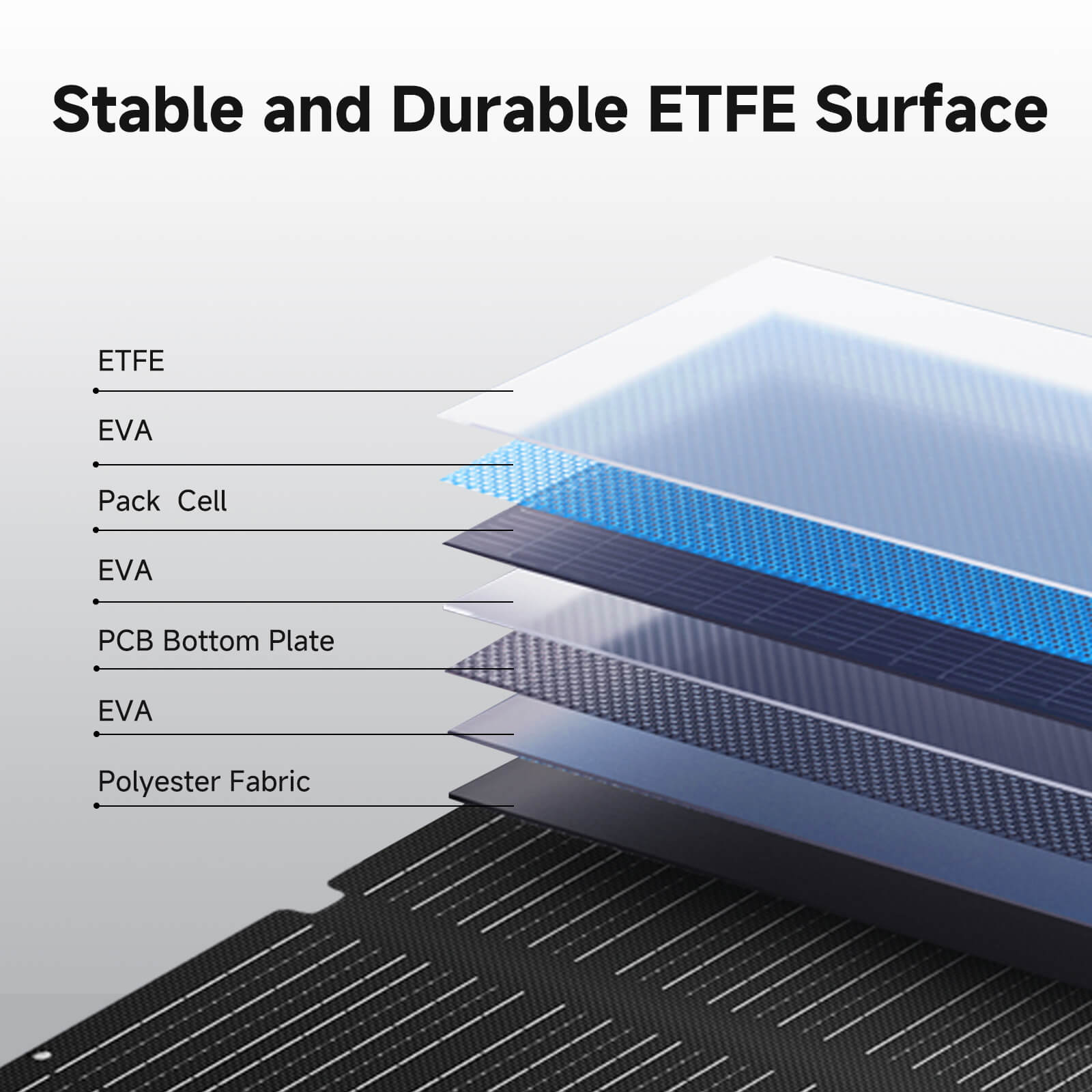 The rear bracket features a flexible adjustment function. You can adjust the angle of the solar panel according to weather conditions and the angle of sunlight to optimize the photoelectric conversion rate. Additionally, the solar panel should not be bent or subjected to violent impacts. Please handle it with care to prevent sharp objects from damaging the ETFE encapsulation layer and reducing transmittance. This IP68-certified solar panel is completely waterproof and dustproof. It can be submerged and withstands the most extreme weather conditions, making it ideal for intensive use in all weather conditions.