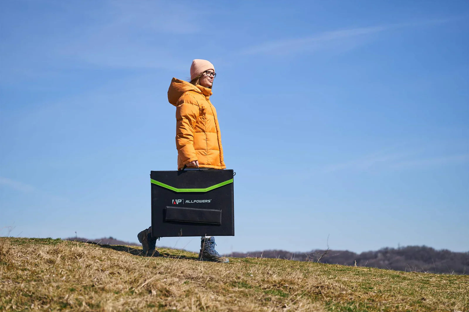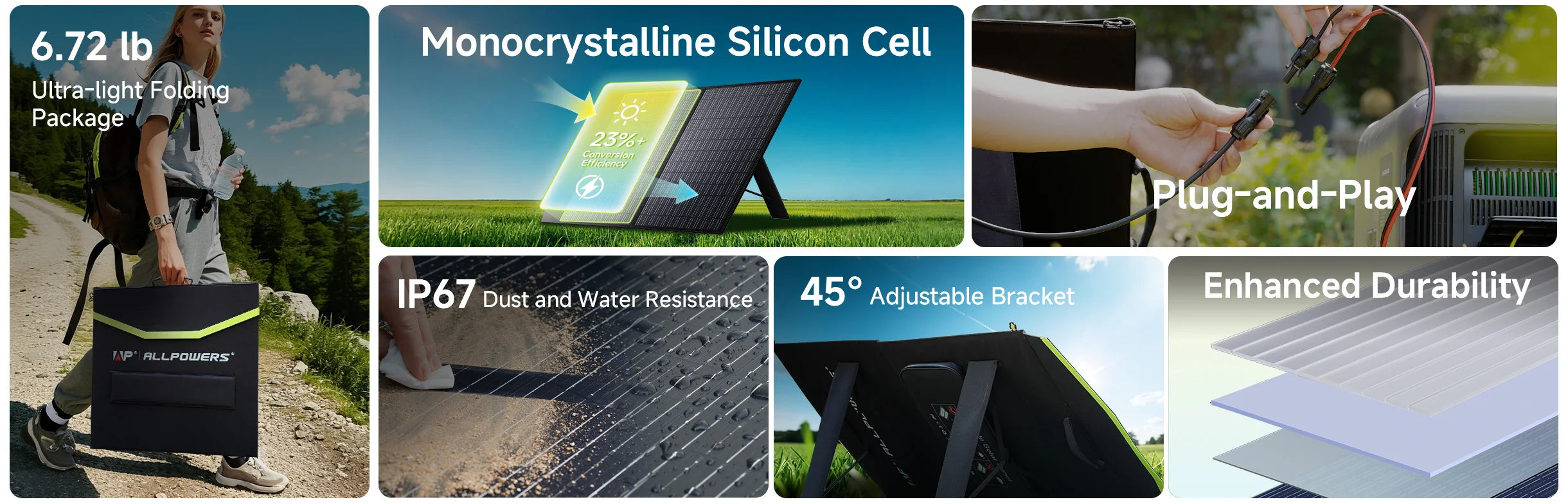ALLPOWERS 100W portable solar panel up to 23% efficiency, 1/3 lighter than the same power of solar silicon. The total power increased by 1/3 in comparison with the same portable solar panel kit size.