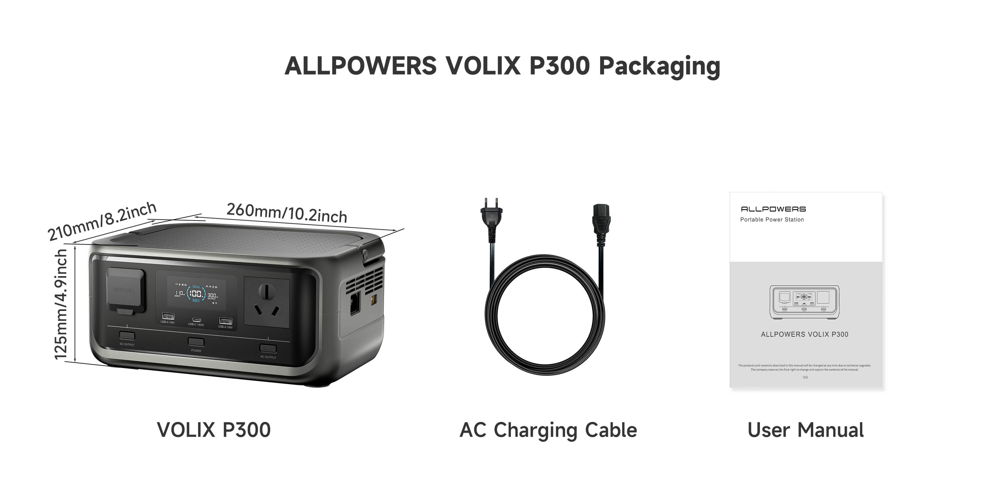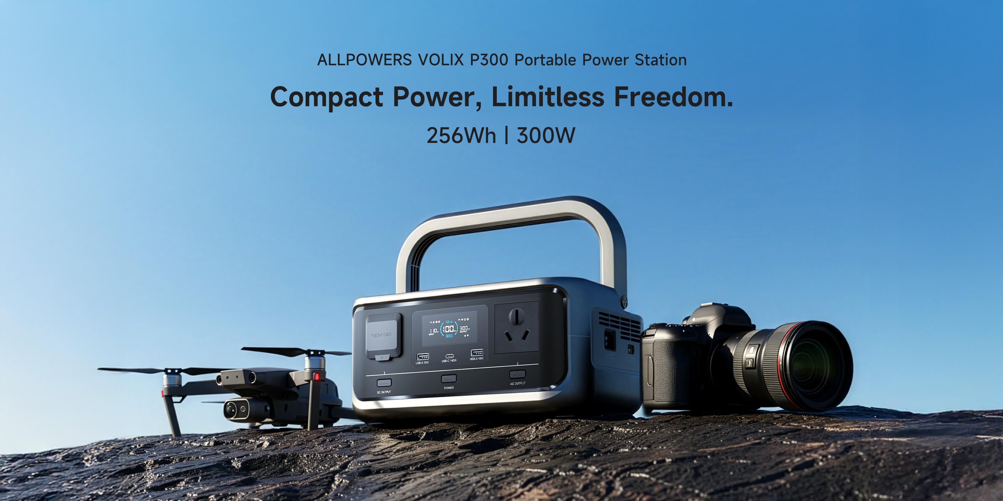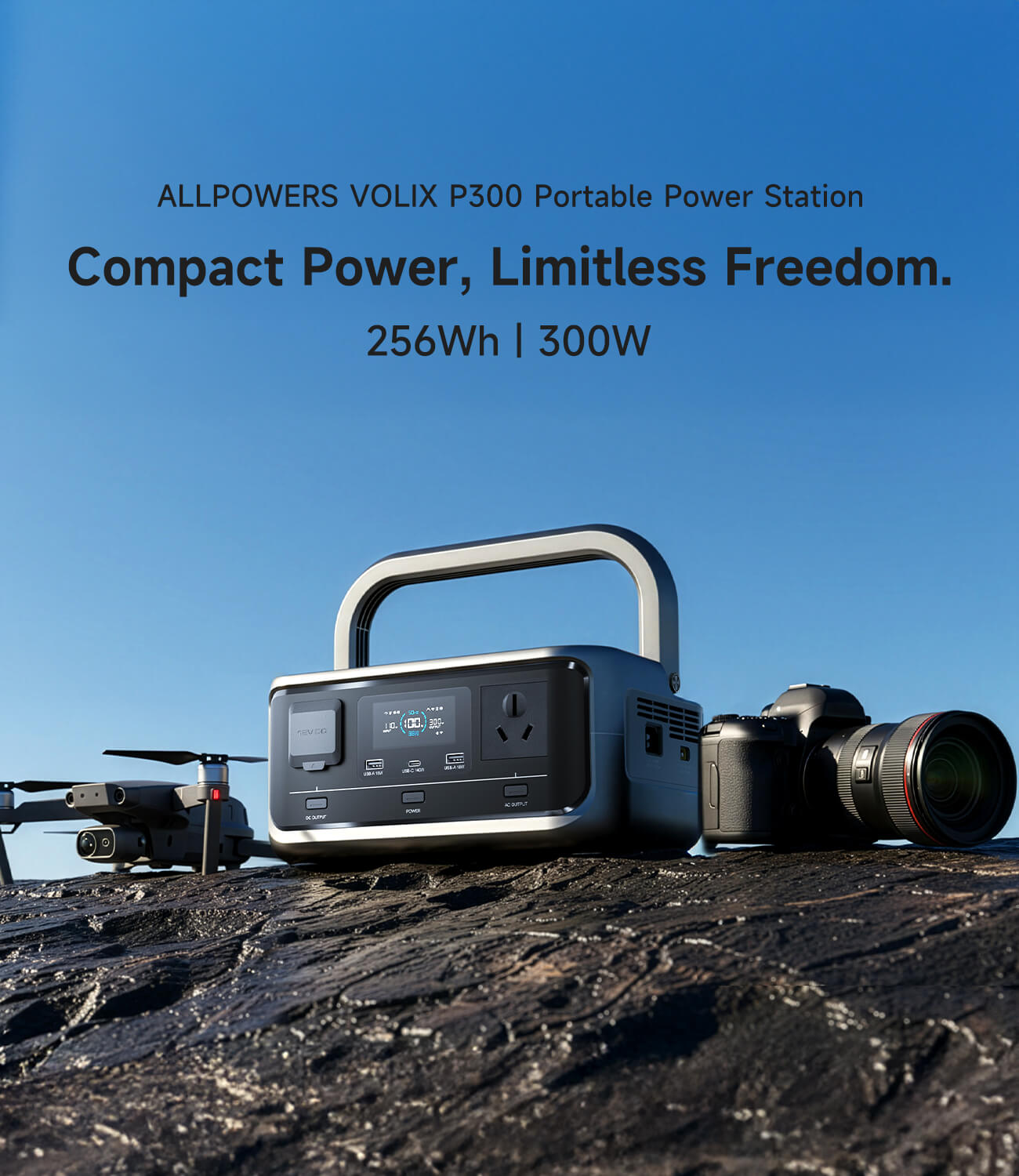 The VOLIX P300 is a lightweight and portable power station designed to meet your on-the-go power needs, keeping you fully charged anytime, anywhere. Weighing only 3.57kg, this power station boasts a maximum output of 300W and a 256Wh battery capacity. It can charge devices such as mobile phones, tablets, cameras, drones, and small appliances via AC or DC output. It's ideal for camping, road trips, or as a backup power source.