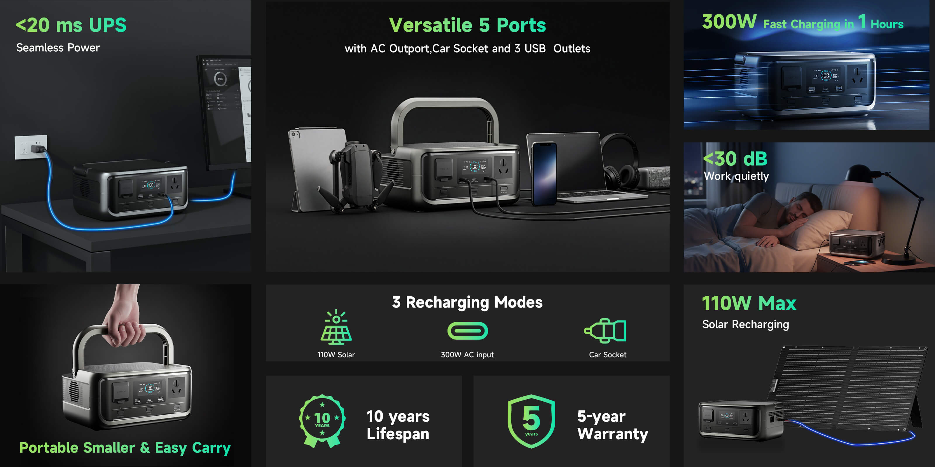 - Fast Charging:Maximum 300W AC input 0-100% within 1 hours;