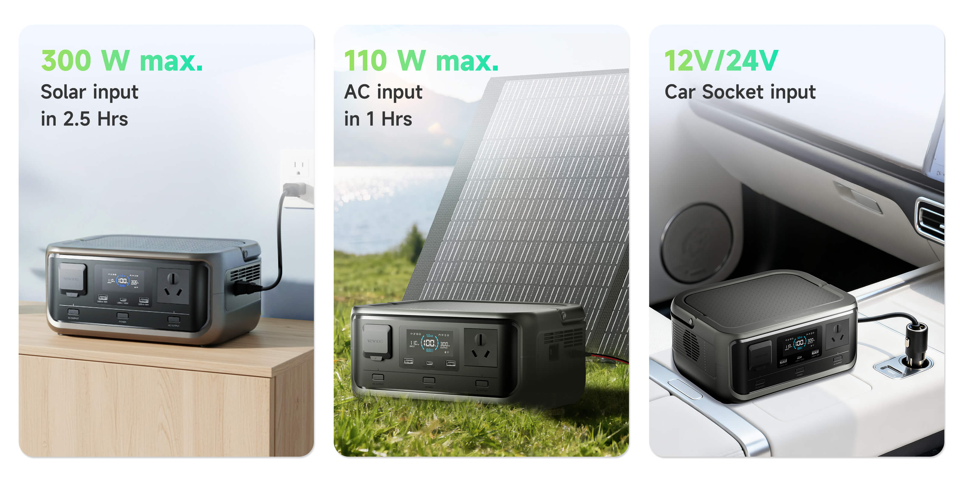 Never be caught without power. The VOLIX P300 gives you unparalleled flexibility with four distinct charging methods:AC Wall Outlet,Solar Panel,12V Car Cigarette Lighter,AC + Solar Simultaneous Charging.Ensuring you can recharge your power station anywhere life takes you—from the comfort of your home to the heart of the wilderness.